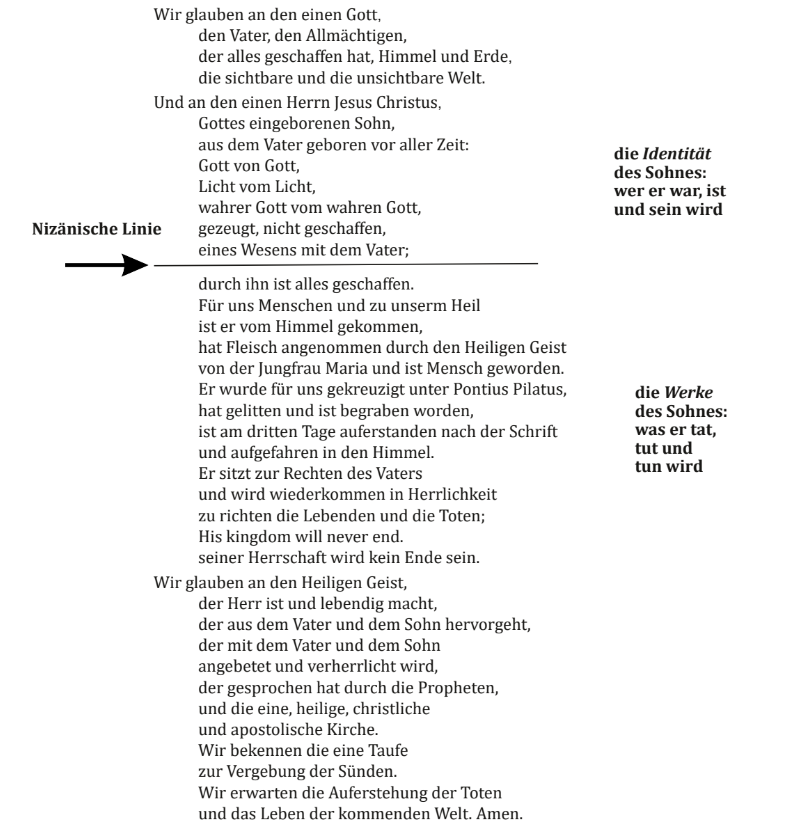 Eine Besonderheit des Nizänischen Glaubensbekenntnisses ist eine ganze Reihe von Aussagen am Anfang, die sich auf die Frage konzentrieren, wer Gott von Ewigkeit her ist. In der Fassung des Glaubensbekenntnisses von 325 gehört die Hälfte des griechischen Textes zu diesem Teil. Dann folgen alle Informationen über das Handeln des Sohnes Gottes in der Geschichte. Zwischen diesen beiden Teilen können wir, dem US-Theologe Fred Sanders folgend, die „Nizänische Linie” ziehen: Oberhalb dieser Linie erhalten wir die Informationen darüber, wer derjenige ist, der geschaffen hat, rettet und richten wird – alle Werke, die unterhalb der Linie aufgezählt werden.